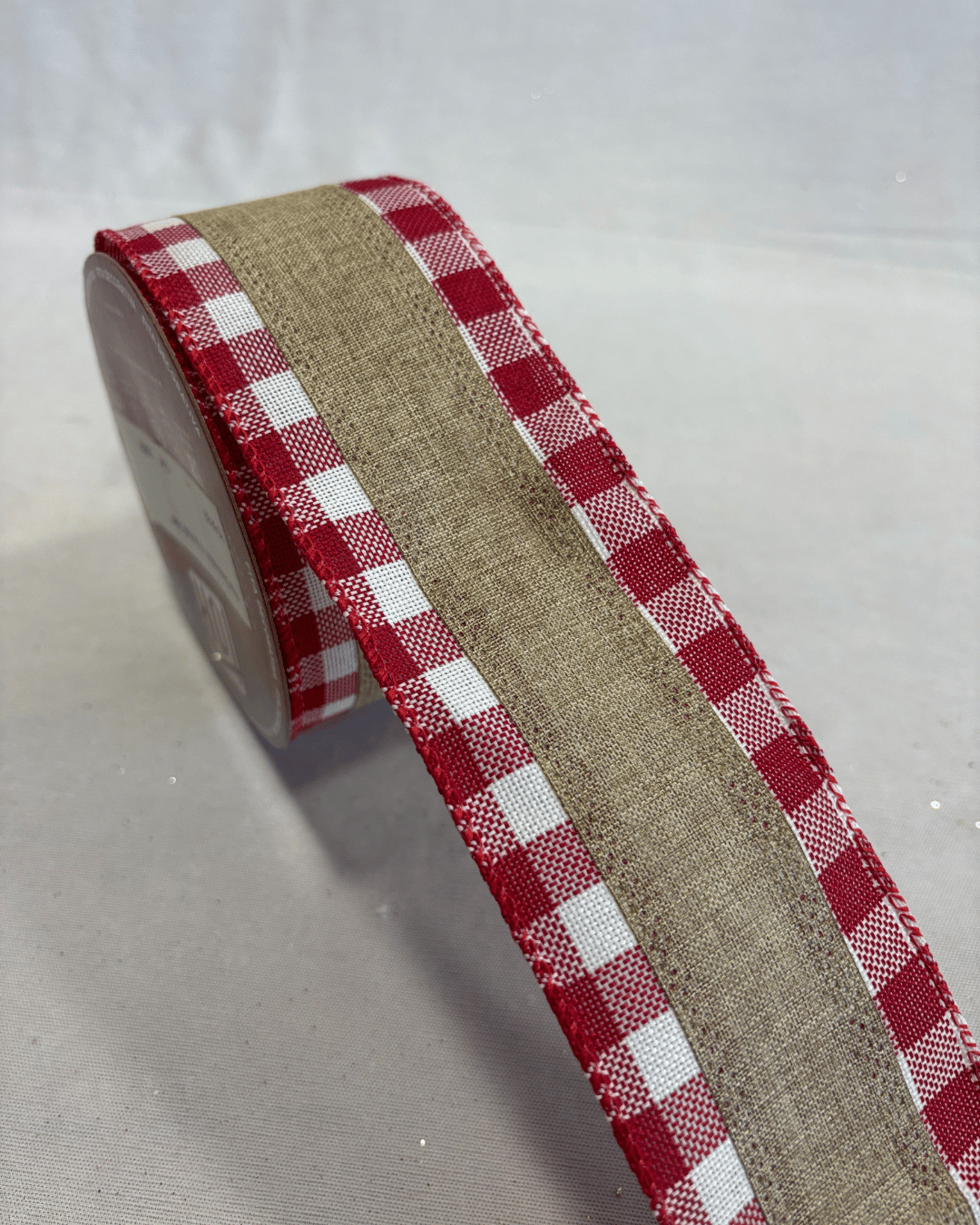 Fita aramada em juta e xadrez vermelho e branco, usada para decoraçao natalina.